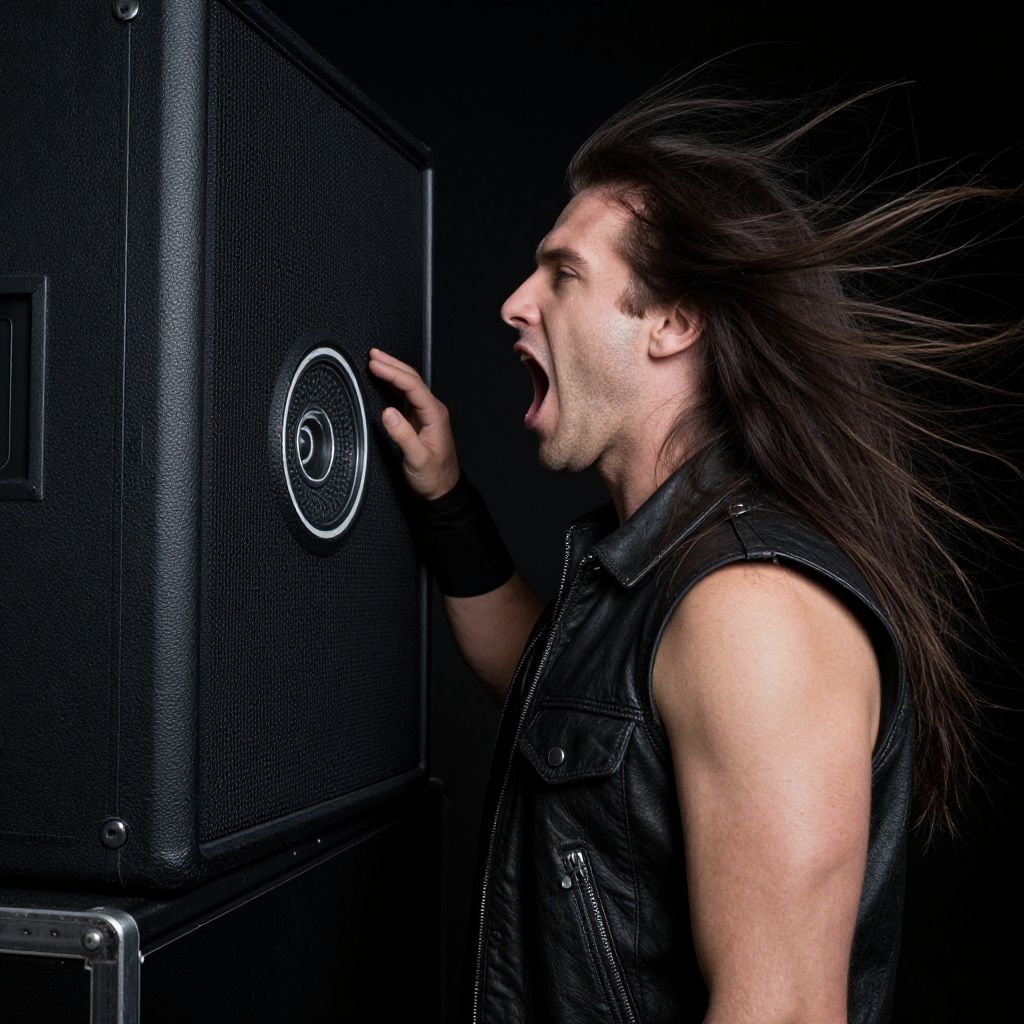 W1nd8l0wn profile photograph of a heavy metal man with long hair and wide-open mouth, seen from the side, He is wearing a leather vest and is standing infront of a massive loudspeaker, looking directly at the speaker, His hair is blown back