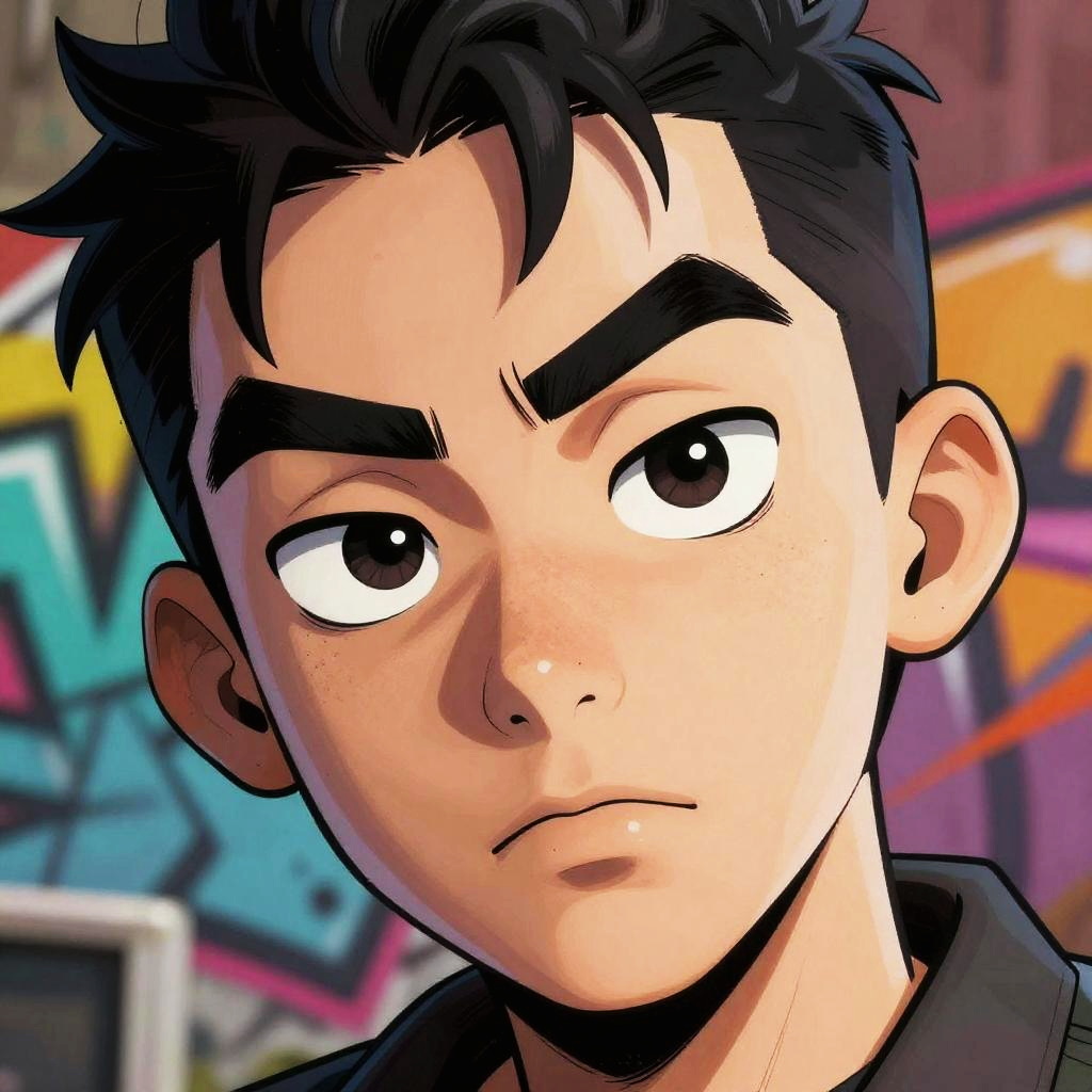 Character with big eyebrows, close-up illustration, exaggerated facial expressions, bold lines, comic book style, vibrant contrast, dynamic pose, urban graffiti background, colorful palette, sharp details, modern art influence