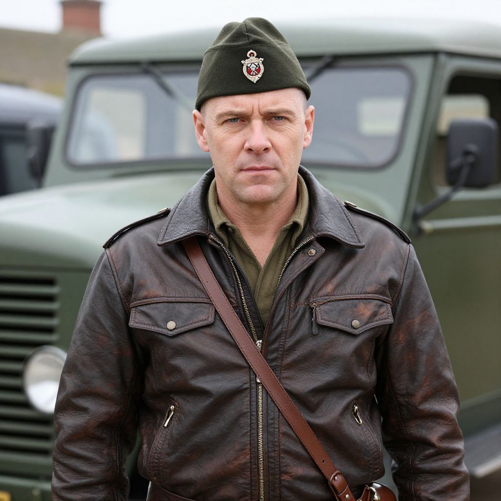 Photograph of a middle-aged white man with a serious expression, standing in front of a green military-style truck. He wears a black military-style beret with an emblem, a dark green shirt under a black leather jacket with silver buttons, and a brown leather strap crossing his chest. The truck's front grille and partially blurred background are visible behind him. The man's skin is fair, and his hair is short. The image has a slightly overexposed, high-contrast style, emphasizing the textures of his clothing and the truck.