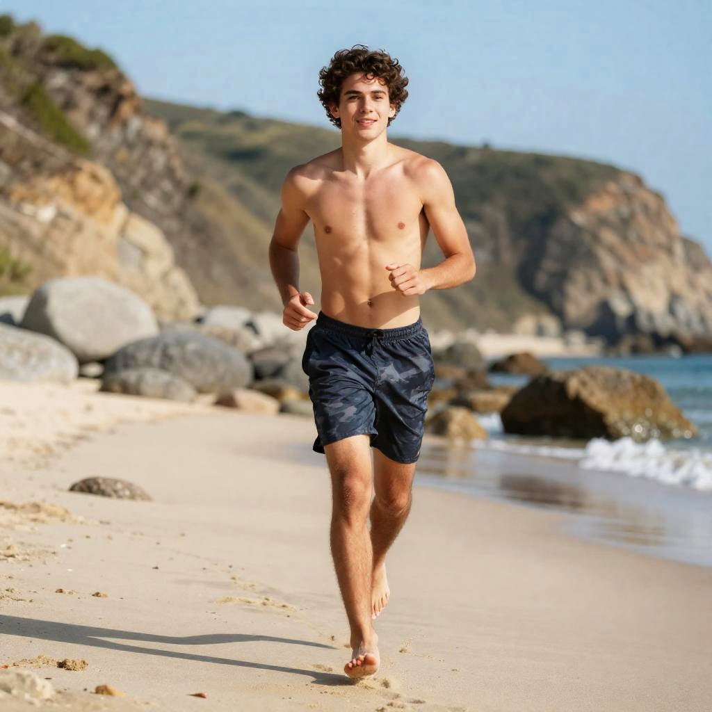 Shirtless young man with curly brown hair, wearing dark blue camouflage shorts, jogging barefoot on sandy beach. Rocky hills in background. Rocks scattered on sand near his feet. Sunny, clear sky above. Man looking forward, smiling slightly.