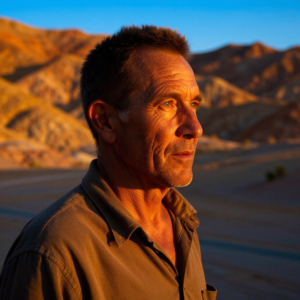 "[[man,old cadillac]]Classic American muscle car, worn leather seats creaking beneath me as I grip the steering wheel of my 1969 Cadillac Coupe DeVille, the rumble of its V8 engine echoing through the desert landscape, sun setting behind me, dusty highway stretching out before me, freedom in every mile. Man has masculine face and piercing eyes"