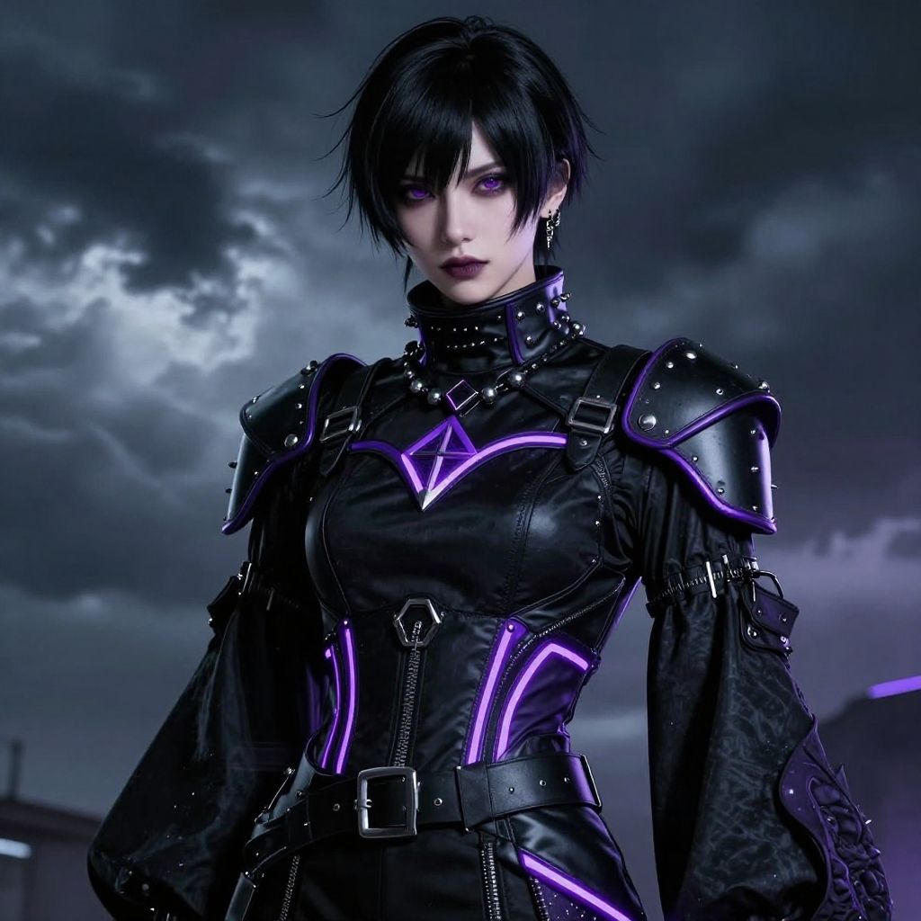 Goth uniform, futuristic twist with sleek black fabric, neon purple accents, metal studs, high collar, stormy background, cyberpunk vibes, high detail character portrait