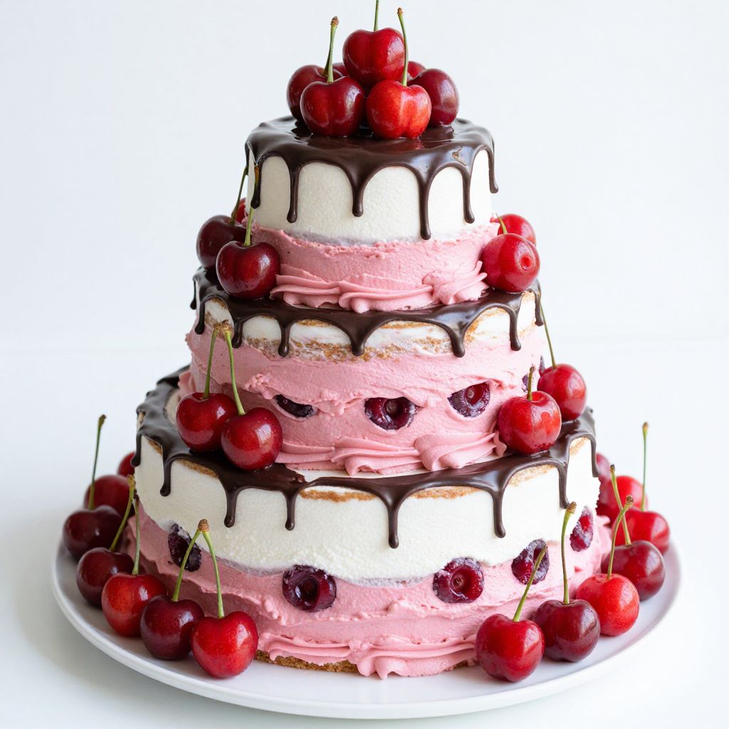 Photograph of a three-tiered cake with pink and white frosting. Each tier is adorned with dollops of white frosting and pink frosting interspersed with dark chocolate drizzle. Cherry halves with stems are scattered across the pink frosting, with some cherries also drizzling with chocolate. The cake sits on a white plate against a plain white background, emphasizing the vibrant colors and textures of the cake. The cherries add a glossy, fresh contrast to the creamy and chocolatey elements. The cake has a slightly rustic, homemade appearance with visible frosting swirls.
