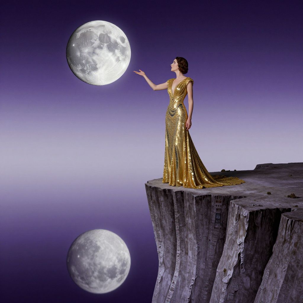 In the surrealistic realm reminiscent of Dalí's iconic dreamscapes, conjure an enigmatic landscape where a lone figure, a woman draped in a resplendent golden gown studded with shimmering sequins, stands upon a precarious tower perched at the brink of a chasm. As she extends her hand towards a levitating lunar sphere emitting gentle bioluminescent light, the vantage shifts to reveal her reflection within the glistening surface, generating an alluring optical illusion that mingles reality and dreamscape. This ethereal tableau is enveloped in a mesmerizing gradient of violet and silver tones, instilling a sense of bewilderment, ambiguity, and reverence as viewers ponder the enigmatic figure's sojourn between realms.