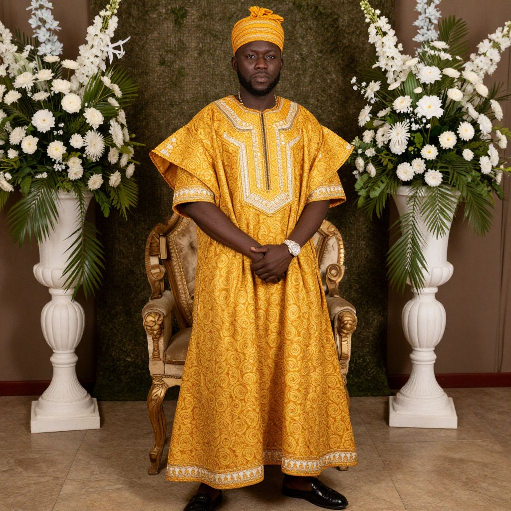 Photograph of a Black man standing in front of a dark textured backdrop. He wears an ornate, bright yellow traditional African robe with intricate gold patterns, a matching yellow headwrap, and black shoes. He stands with hands clasped in front, wearing a white wristwatch. He is positioned in front of an elegant, vintage wooden chair with gold accents. On both sides of the chair, tall white vases hold lush arrangements of white flowers and green leaves. The floor is tiled in a light brown color. The overall setting is formal and richly decorated.