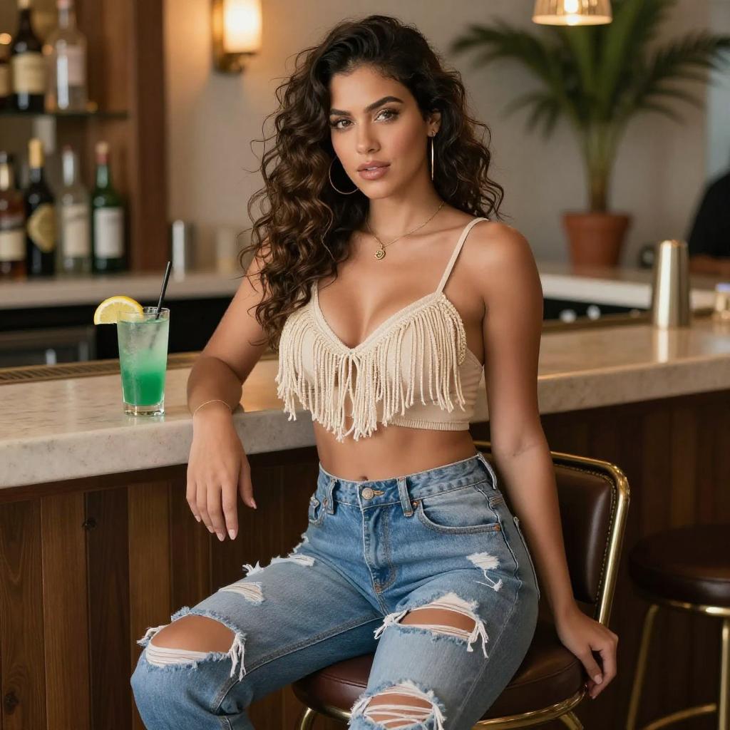 Photograph of a young woman with long, curly brown hair and olive skin, sitting at a bar. She wears a beige, fringe crop top with thin straps, revealing her midriff, and high-waisted, ripped blue jeans. She has hoop earrings and a gold necklace. Her expression is calm and confident. The bar has a marble countertop, wooden shelves with various bottles, and a green cocktail with a lemon slice in a glass to her left. Warm lighting and a potted plant are in the blurred background. She sits on a brown barstool with gold accents.