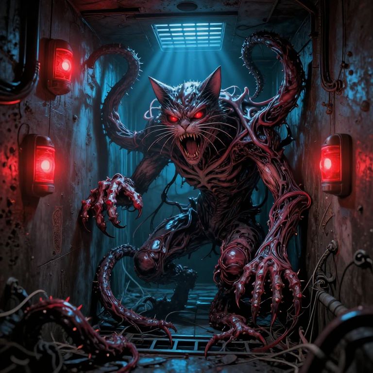 Comic book style A monstrous entity grotesquely melded to the wall in a narrow maintenance shaft, with multiple twisted tentacles extending defensively from its body, Blue light filters through ventilation grilles, casting thin beams across the slick, mutated flesh binding it to the wall, Red emergency lights blink rhythmically, casting an eerie hue on its hideous, toothy maw that screams without sound, Its sinewy tentacles, covered in small, hooked barbs, reach out as if sensing movement, adding a chilling sense of malevolence to the confined space