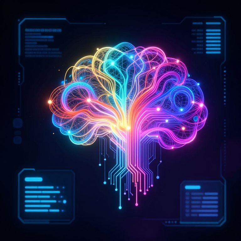 Neon digital illustration of a glowing, colorful brain with intertwined, luminous lines and circuitry, set against a dark, tech-themed background.
