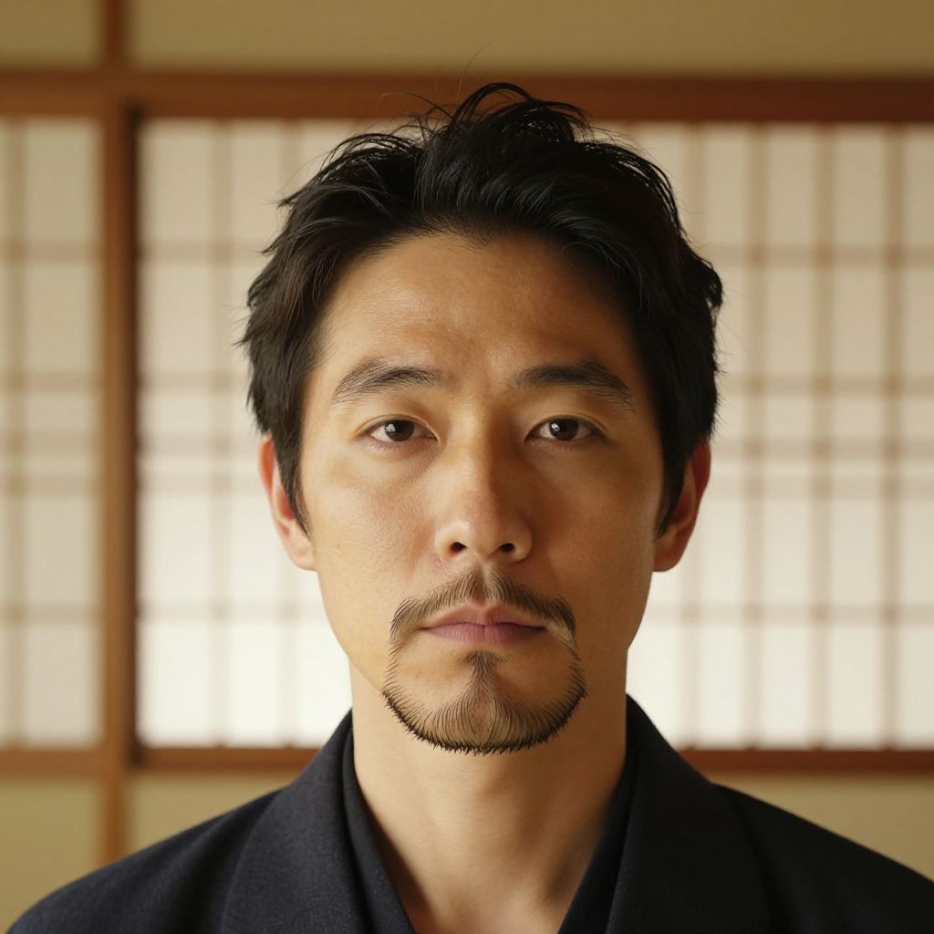 Photograph of an East Asian man in his 40s with short, slightly messy black hair and a trimmed goatee. He has a serious expression, brown eyes, and is wearing a dark navy kimono with a high collar. The background features a traditional Japanese shoji screen with wooden frames and white translucent paper panels. The lighting is soft, highlighting the man's face while creating a warm, slightly blurred effect in the background. The overall composition emphasizes a traditional, serene atmosphere.