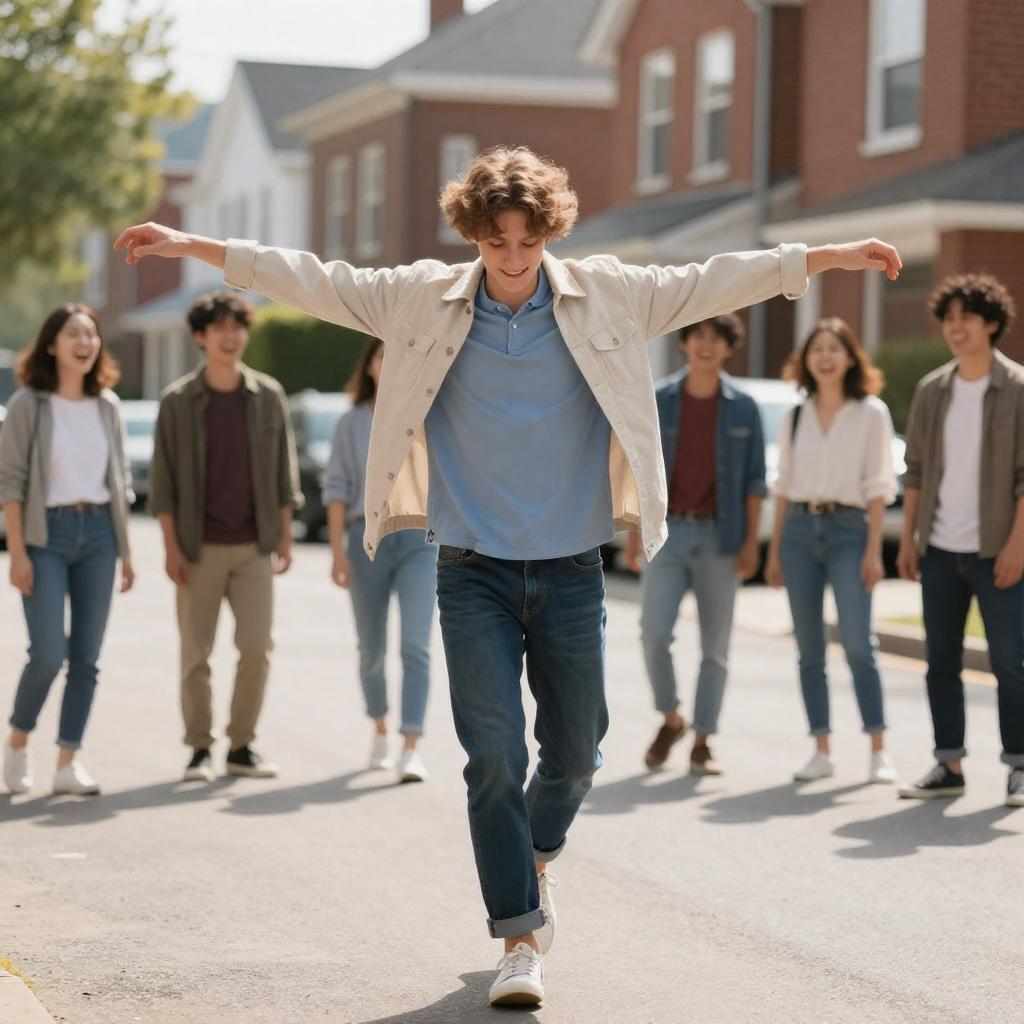 Photograph of a nighttime backyard pool party. A person in mid-air jumps into the pool with a blue and white soccer ball. Crowded group of 15 people in casual summer clothes stands on the pool's edge, watching. Clotheslines with hanging garments are on the right. Brightly lit house in the background. Pool in the foreground. Intense expressions on some faces.
