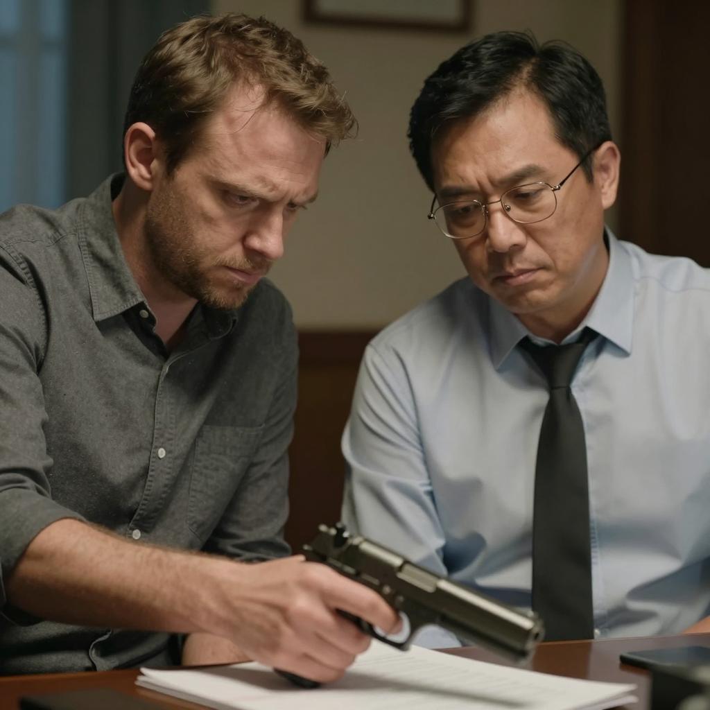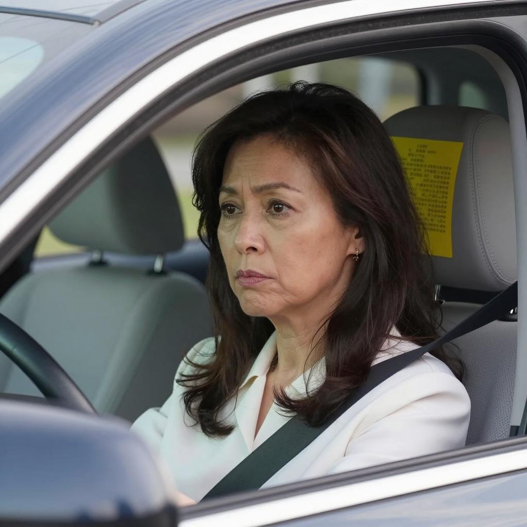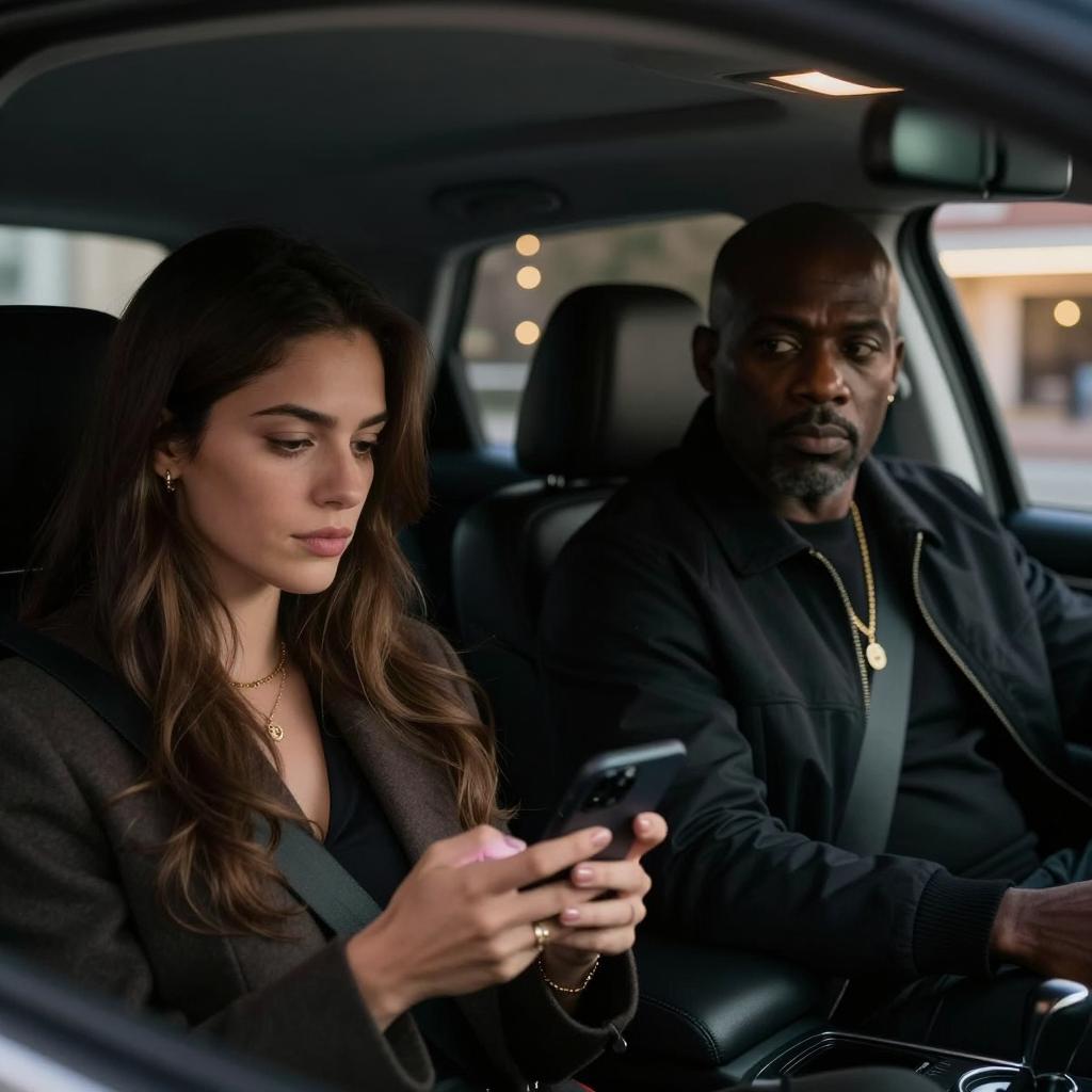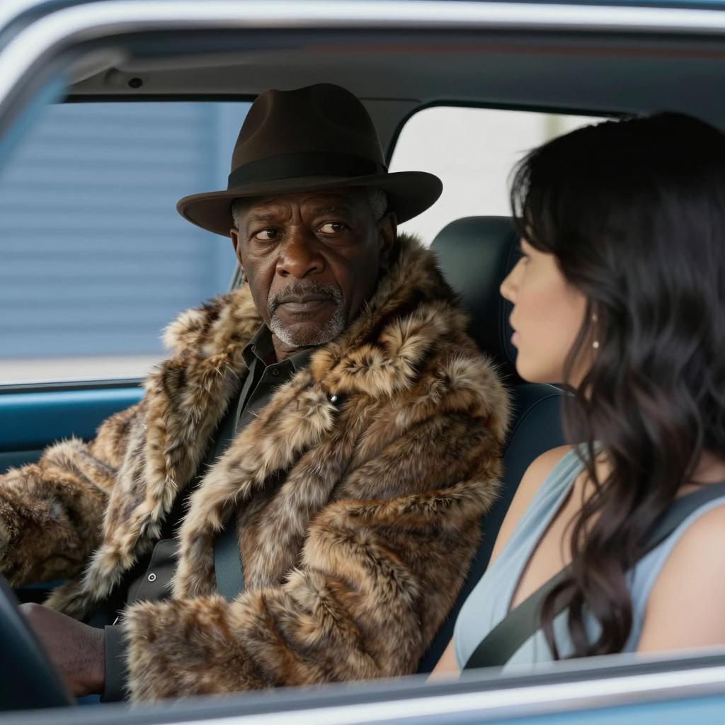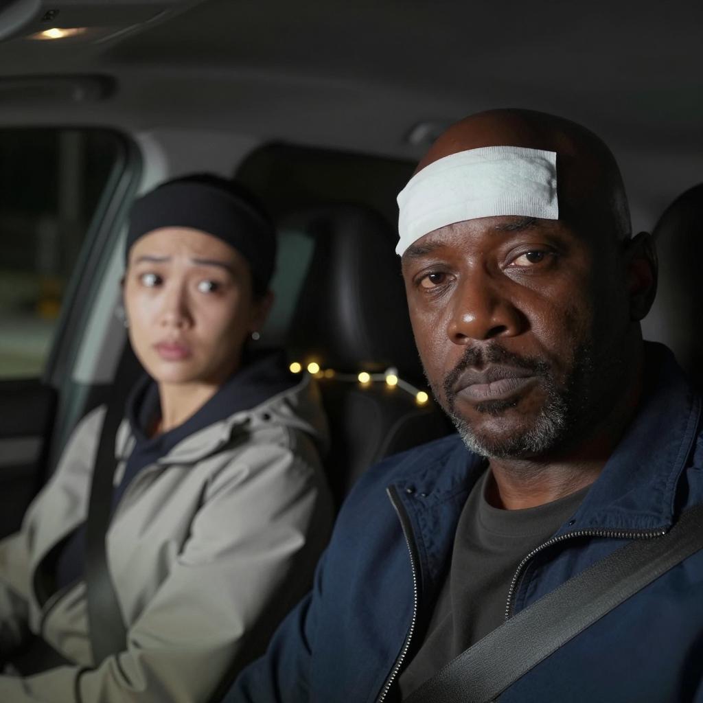 Photograph of a car interior at night. Foreground: bald black man with bandage on forehead, serious expression, wearing blue jacket. Background: Asian woman with black headband, light gray jacket, slightly concerned expression. String lights along backseat. Both seated, man closer to camera. Dim lighting.