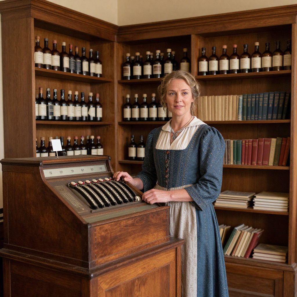 Woman in period costume stands behind a vintage wooden cash register, surrounded by shelves stocked with numerous bottles and books in a warmly lit interior reminiscent of Sovereign Hill, Australia.