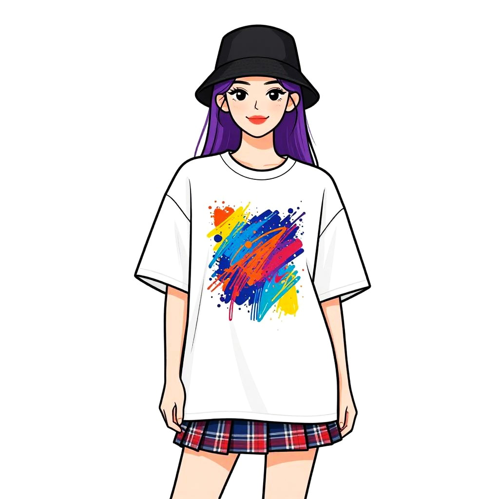 Woman with pretty face and pretty hair. smiling Woman, casual streetwear, oversized plain white t-shirt, round neckline, short sleeves, black mini skirt peeking out beneath, long pendant necklace, wide-brimmed black felt hat, solid grey background. --sref 1467