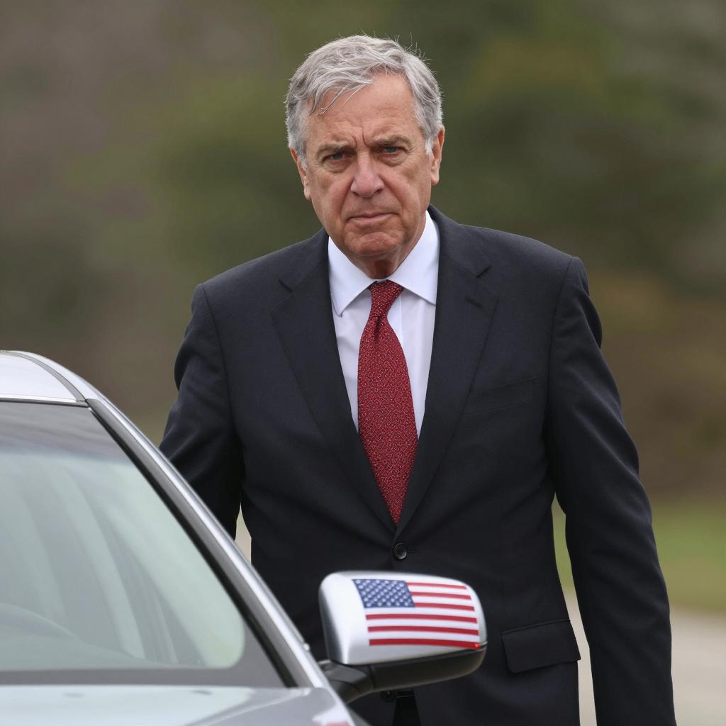 Middle-aged man with gray hair wearing a dark suit, white shirt, and red patterned tie, standing next to a car. He has a serious expression. The car has an American flag on the side mirror. Background is blurred with greenery. Daytime setting. The man's left hand rests on the car door.
