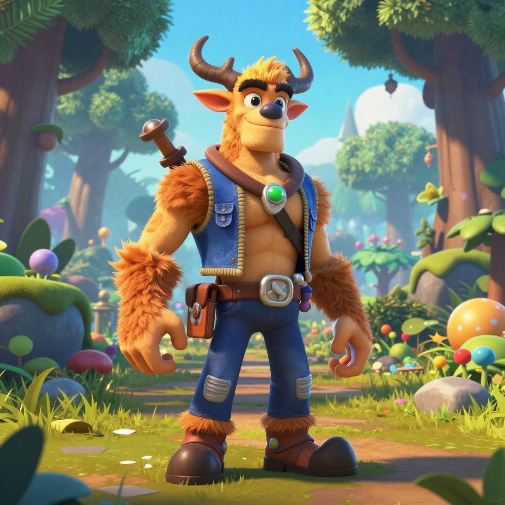 PlayStation Hagrid with a mystical giant companion, vibrant enchanted woods background, video game-inspired look, highly detailed character design, dynamic lighting