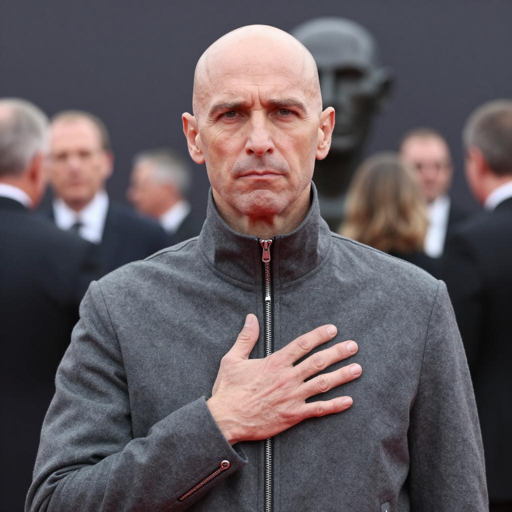 Bald man in a gray, high-collared jacket with a zipper, right hand on chest. Background: blurred people in formal attire, dark walls, abstract sculpture. Man's facial expression: serious, slightly raised eyebrows. Number of people: 7.