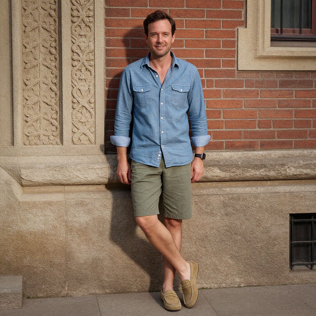 A man, soft chambray button-up shirt, faded denim look, olive green twill Bermuda shorts, tan suede loafers, historic brick exterior, intricate stone carvings, hand-tinted photograph, relaxed smile, warm sunlight. Man has masculine face and piercing eyes