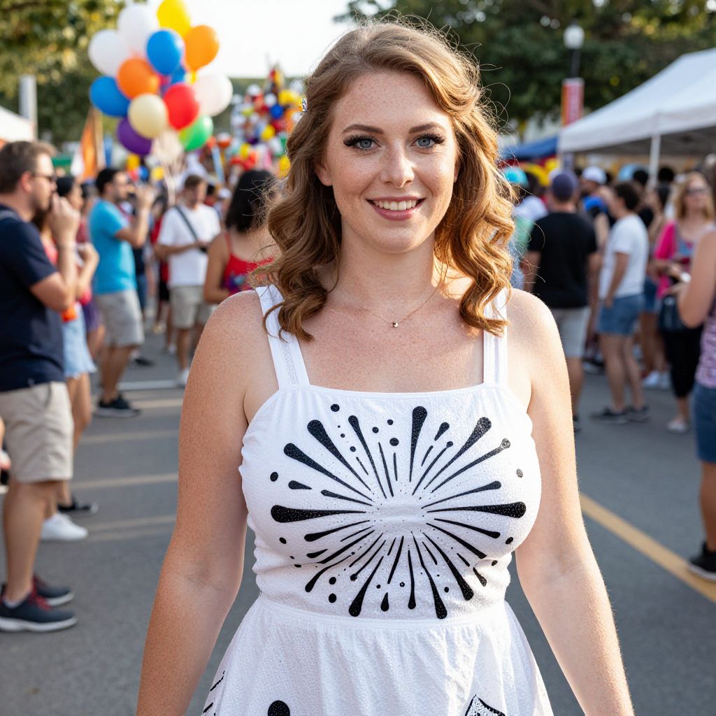A lively outdoor festival scene where a woman in her early 30s with freckles and bright blue eyes wears a white dress adorned with black spots that form a playful, abstract design resembling fireworks. She's standing at the edge of a lively parade, with colored balloons, music, and crowds in the background. The dress shimmers slightly in the afternoon sun, giving a joyful and festive tone to the image.. The woman has big tits and cute face