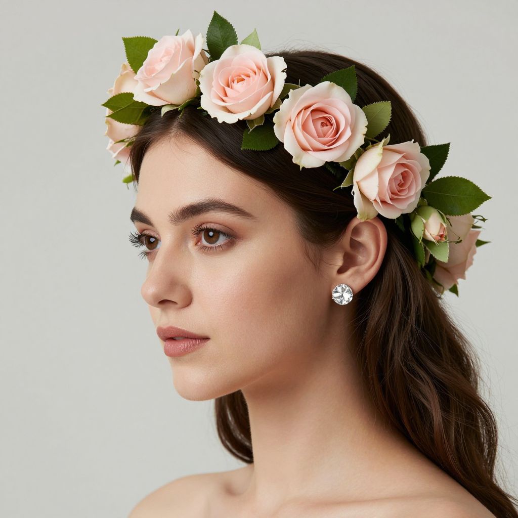 Elegant woman wearing a delicate flower crown adorned with soft pink roses and vibrant green leaves, complemented by a sparkling diamond earring, exuding bohemian charm against a minimalist backdrop.