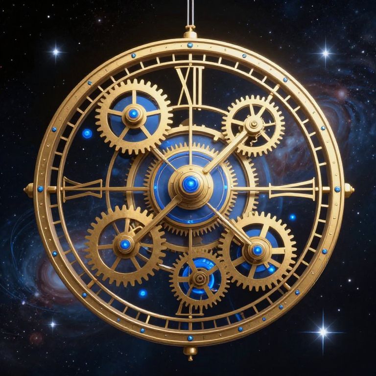 Suspended in the cosmic expanse, a grand celestial clockwork intricately crafted with golden gears and luminous blue accents hums with otherworldly precision, its mechanical arms pointing toward distant stars and nebulae, symbolizing the timeless dance of the universe.