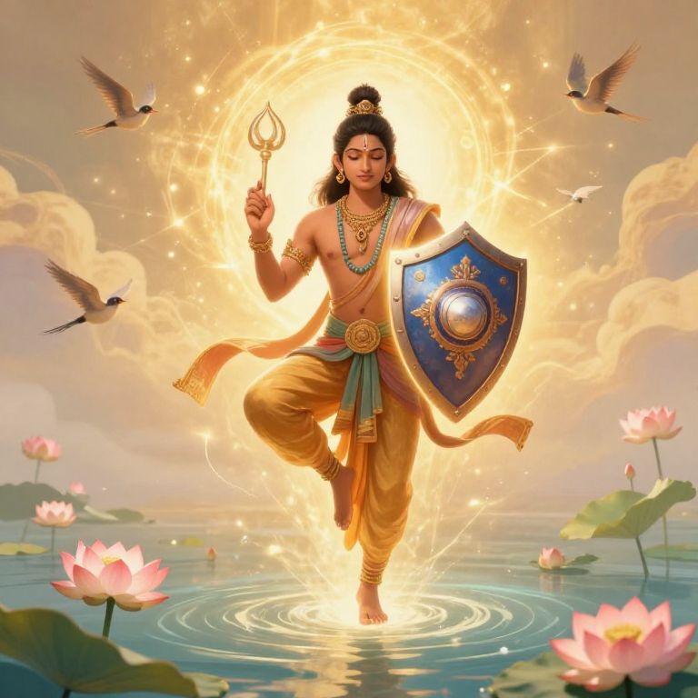 Murugan as a young warrior in a temple of light, floating above water, holding a shield that emits a soft glow, surrounded by lotus blossoms and flying birds, peaceful divine energy, soft golden hues, mythic aesthetic.