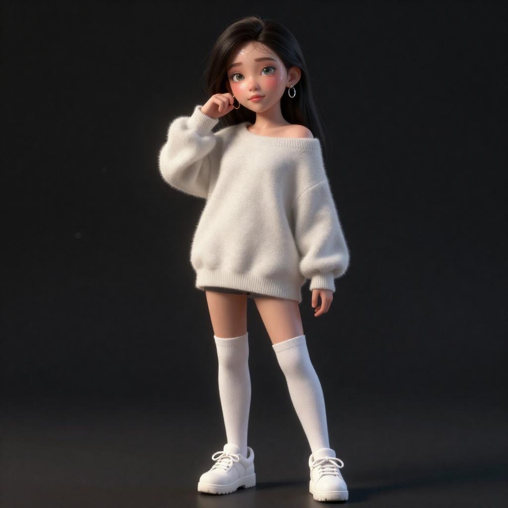 (best quality, masterpiece, ultra highres:1.2), official art, extremely detailed CG unity 8k wallpaper, sharp focus, intricate detail, 1 girl, (standing:1.2), (oversized_sweater:1.1), In bright light, beautiful 16 year old girl posing for full body photoshoot with exposed shoulders, thigh high socks, (white ugly_shoes:1.3), intricately detailed face and eyes, younge face, blush, glistening sweaty skin, dynamic pose, colored eyeliner, cream lipstick, lip gloss, torc earrings, black long hair, The Side Shave, in studio, black_background, bokeh, (cinematic lighting)