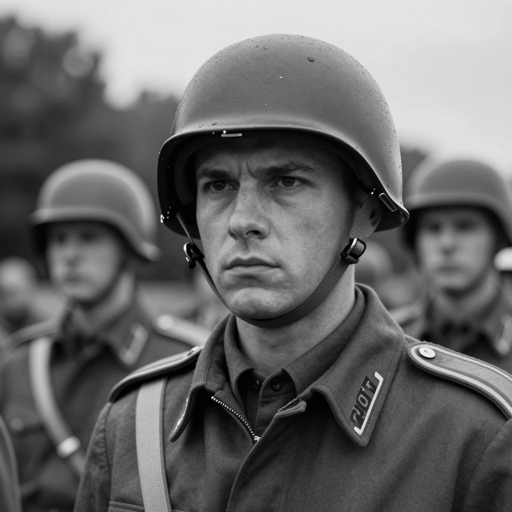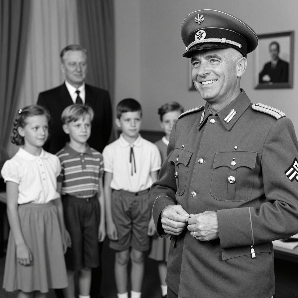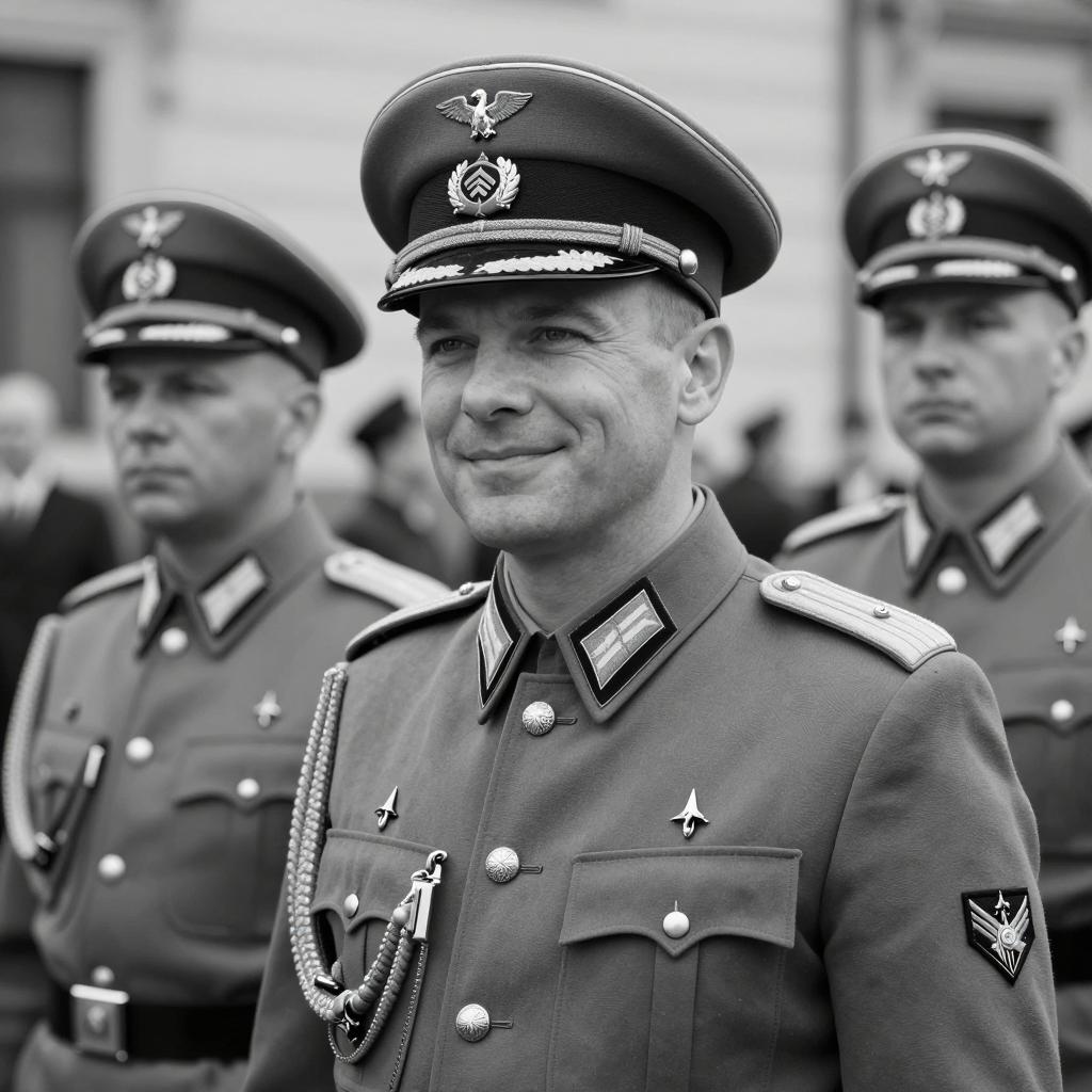 Black and white photograph of a Nazi military officer in uniform, wearing a peaked cap with an eagle and swastika emblem. He has a slight smile, close-cropped hair, and an ornate chest insignia. Two other officers in similar uniforms stand in the background. One officer on the right has a neutral expression. Blurred figures and architectural details are in the background.