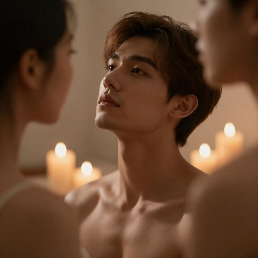 Two young Asian men standing by a large window in a bathroom. One man is shirtless wearing white underwear, sitting on the counter, while the other stands beside a sink wearing a dark checkered robe. Both men hold hands and gaze at each other with a neutral expression. The window shows an overcast cityscape background.