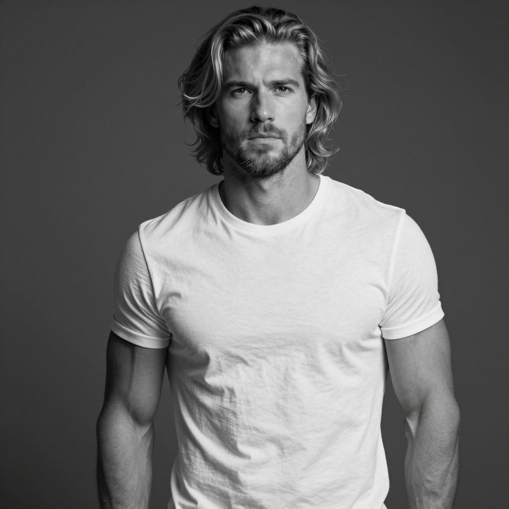 Black and white photograph of a handsome, muscular man with short, dark hair and intense eyes, sitting against a textured wall. He's wearing a simple, tight-fitting white t-shirt, highlighting his strong arms. The lighting is natural, creating sharp contrasts and shadows. Camera angle is slightly above eye level, capturing his upper body. Background is slightly blurred, keeping focus on the subject. The image has a shallow depth of field.