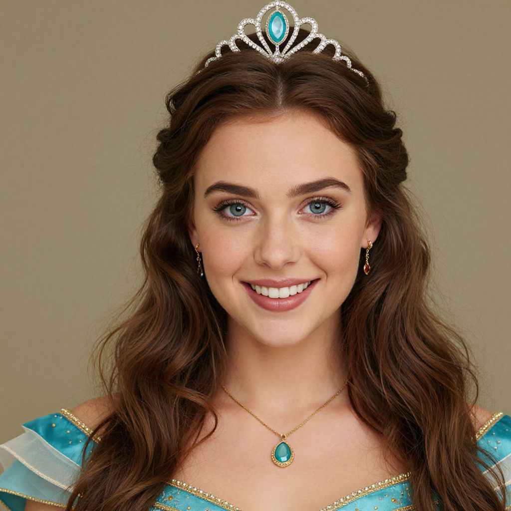 "princess fiona ogre costume, 1girl, solo, jewelry, necklace, brown hair, tiara, earrings, realistic, blue eyes, dress, smile, green eyes, lips, long hair Realistic photo of casual sexy person with pretty face"
