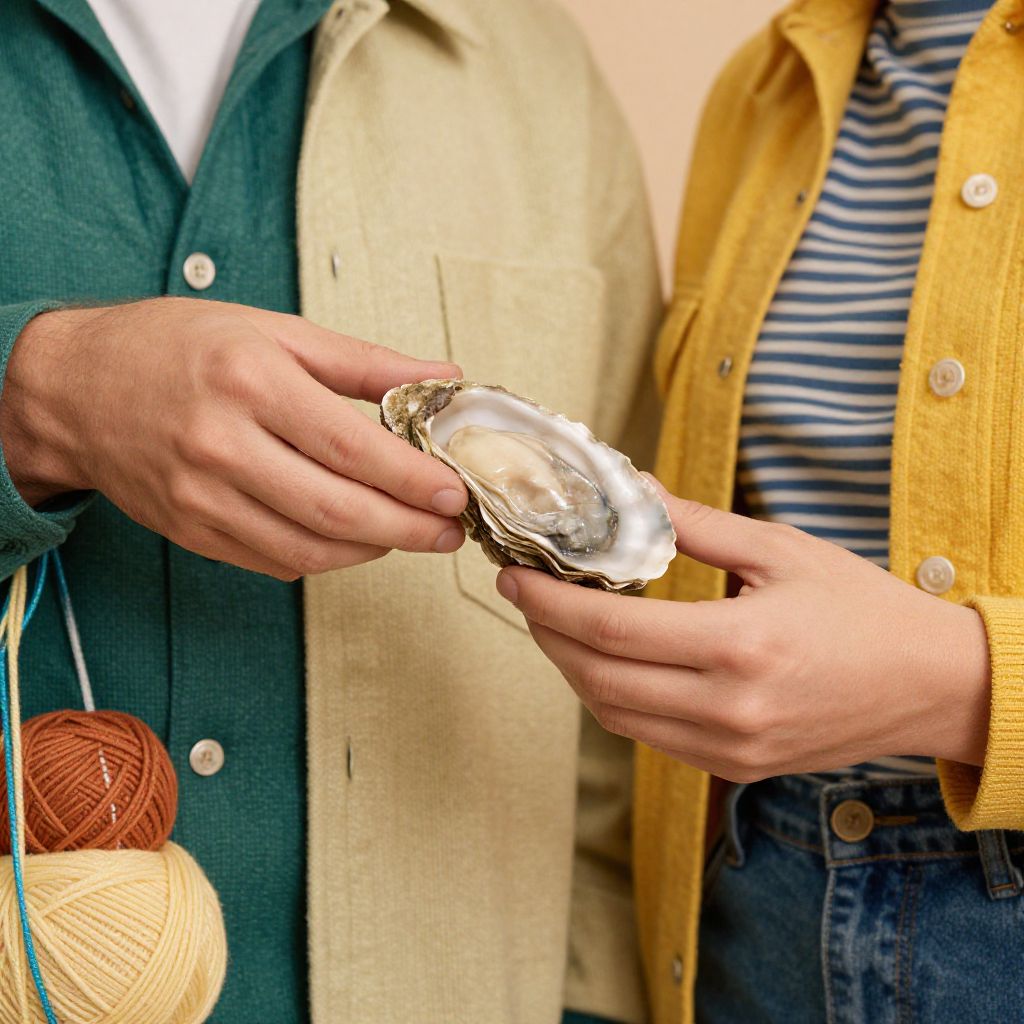 Photograph of two hands holding a wrapped oyster, with colorful yarn balls in the background, wearing green, beige, and yellow jackets.