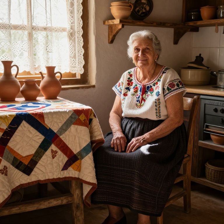Abuela sitting in a cozy rustic kitchen, sunlight streaming through lace curtains, surrounded by handmade quilts and clay pots, warm smile, traditional embroidered dress, soft warm color palette, detailed textures of aged wood and fabric, heartwarming atmosphere.