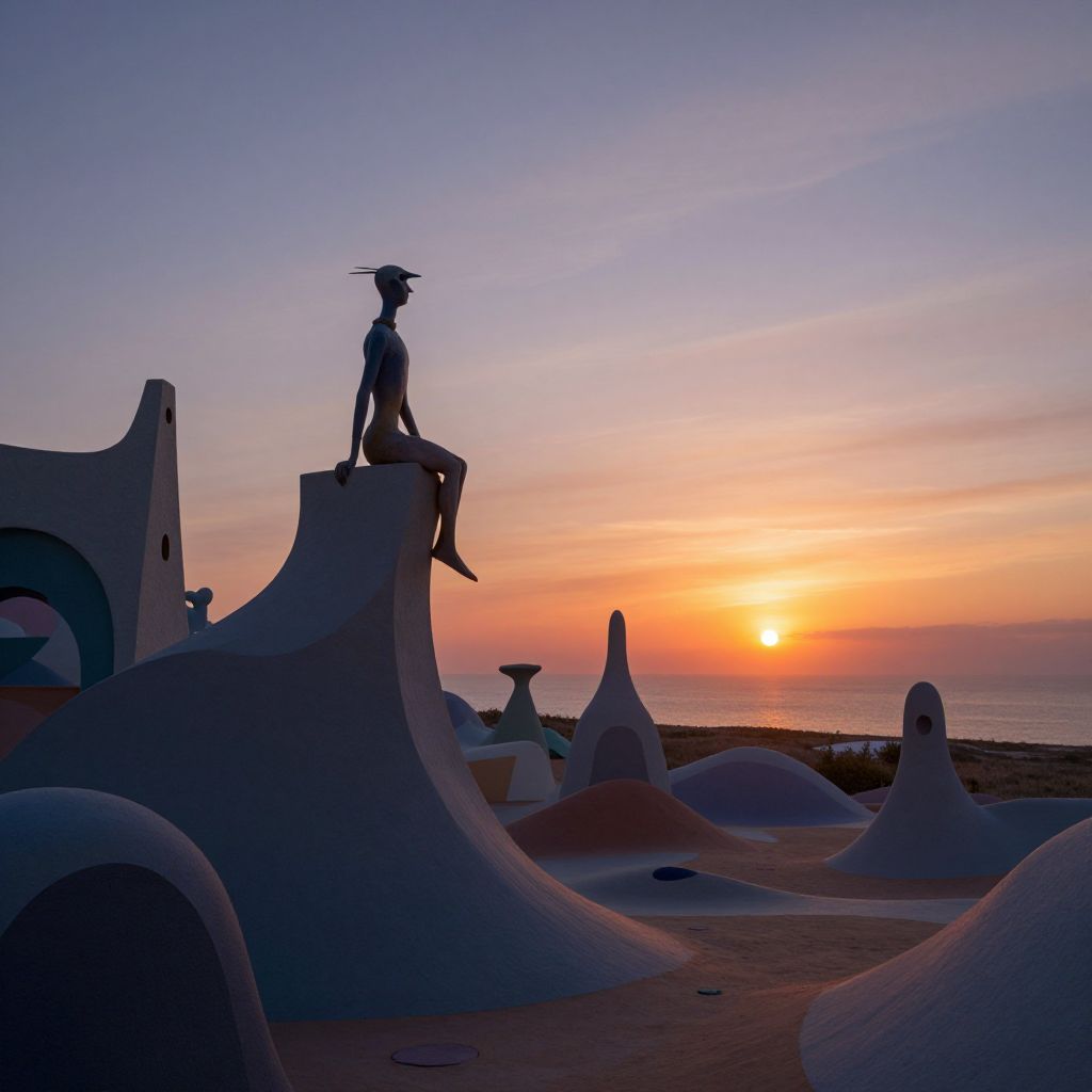 Silhouetted figure in hat sits on curvy sculpture at sunset, beach in background, orange and purple sky, modern art landscape.