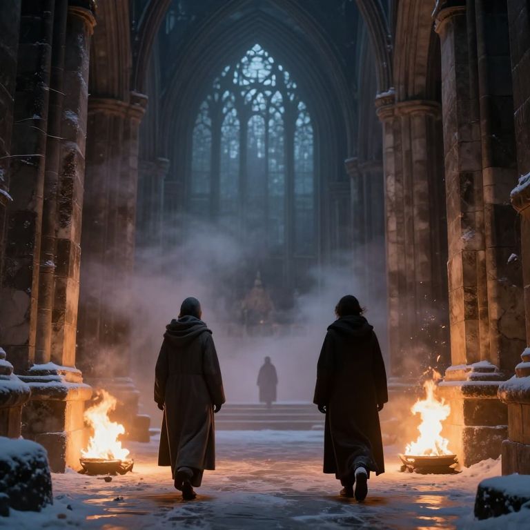 Amidst the ethereal glow of frozen fire and the whispering echoes of ancient stone, figures traverse a cathedral of paradox, where the warmth of hope contrasts sharply with the chill of uncertainty, evoking a profound sense of existential wonder and introspective solitude.