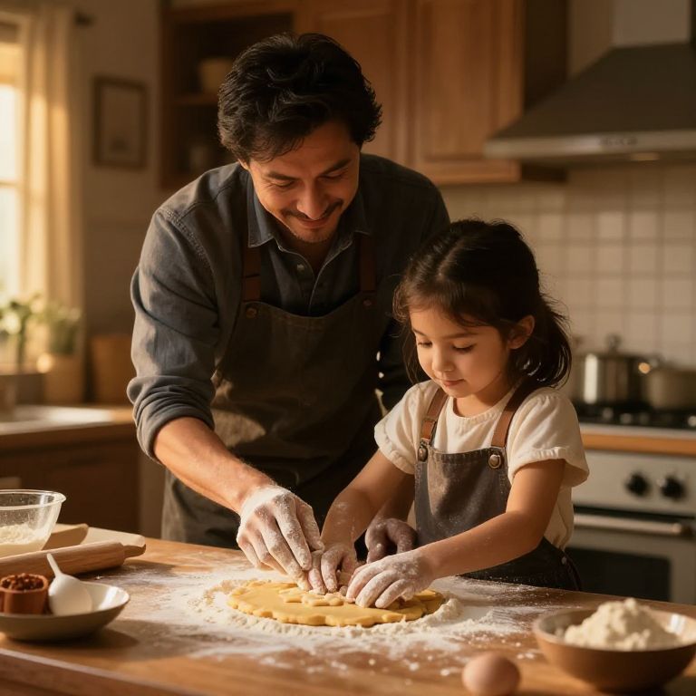 Prompts for father and daughter: A cozy kitchen moment where a father teaches his daughter to bake cookies, flour on her hands, smiling faces, wooden table, warm lighting, nostalgic and cheerful ambiance, detailed realism.
