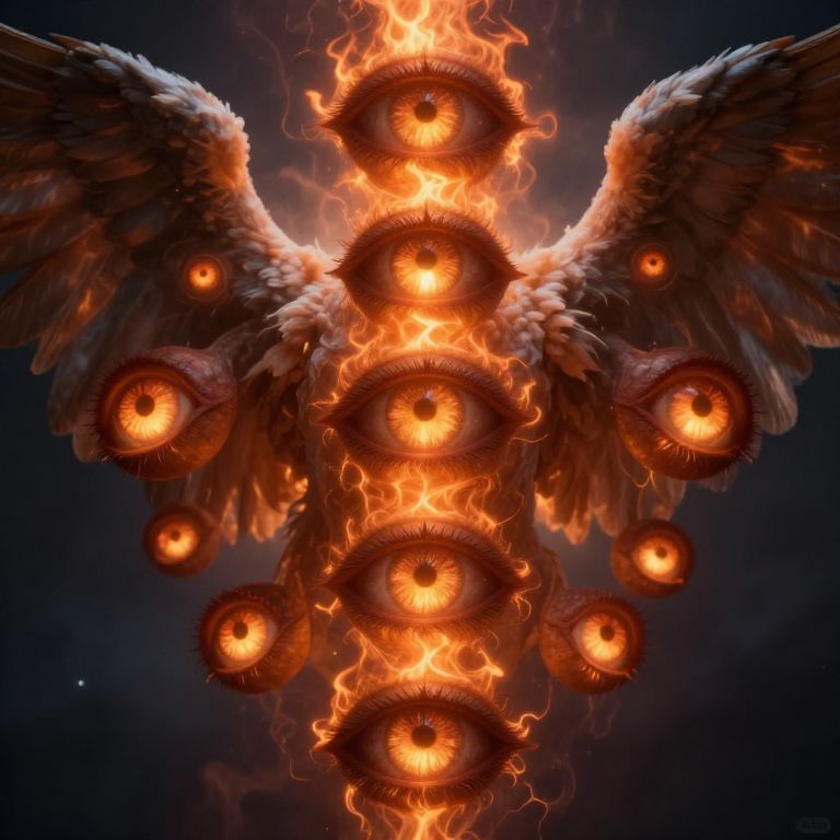 Digital artwork of a fiery, multi-eyed angel with six large, burning eyes and outstretched, feathered wings against a dark, cosmic background.