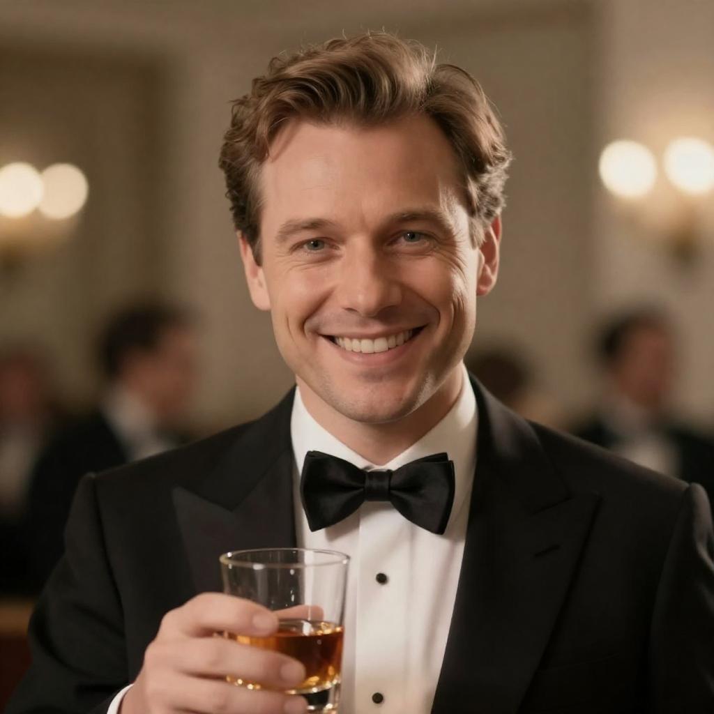 Photograph of a smiling man with light brown hair, wearing a black tuxedo and bowtie, holding a glass of amber-colored liquid in the foreground. Background features bokeh lights and blurred metallic elements. Man's face centered, slightly angled to the right.