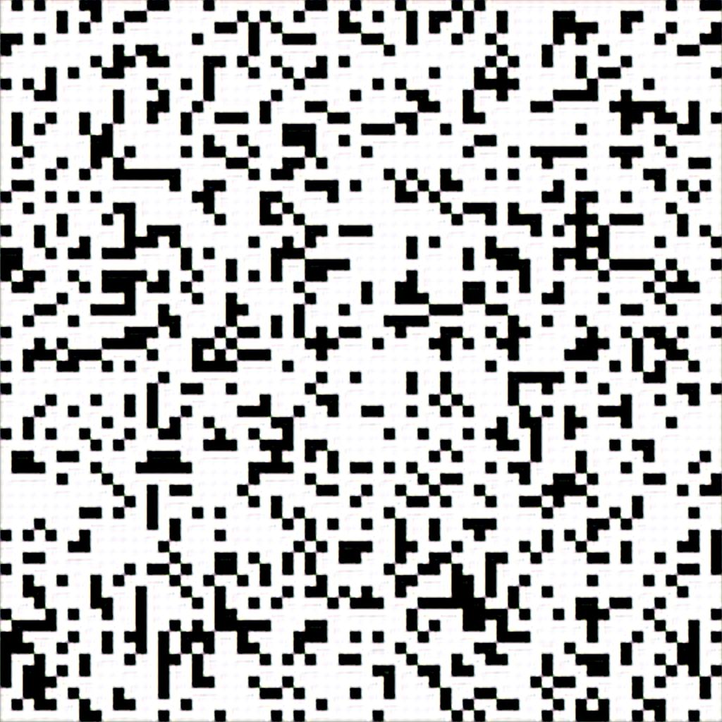 Close-up image of an abstract pattern composed of irregular black pixel blocks on a white background. The design features a random arrangement of squares and lines creating a modern, digital texture effect.