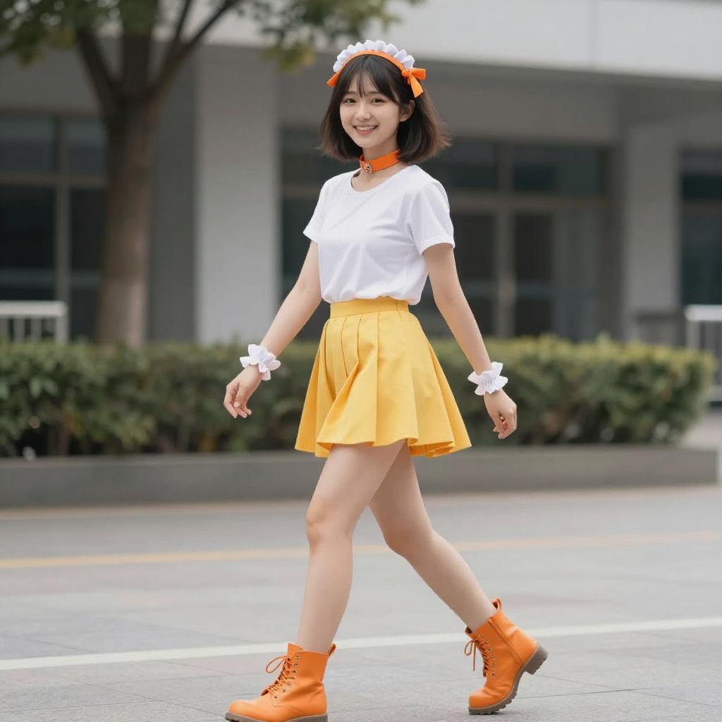 Photograph of an Asian woman with shoulder-length black hair, wearing a white short-sleeved t-shirt, high-waisted yellow pleated skirt, orange lace-up boots, and white floral headband. She accessorizes with white wristbands and an orange bow. She's walking outdoors on a paved street with a blurred background of greenery and a modern building. Her expression is cheerful, and she's positioned slightly to the right, with her left leg forward. The overall style is cute and youthful, reminiscent of kawaii fashion.