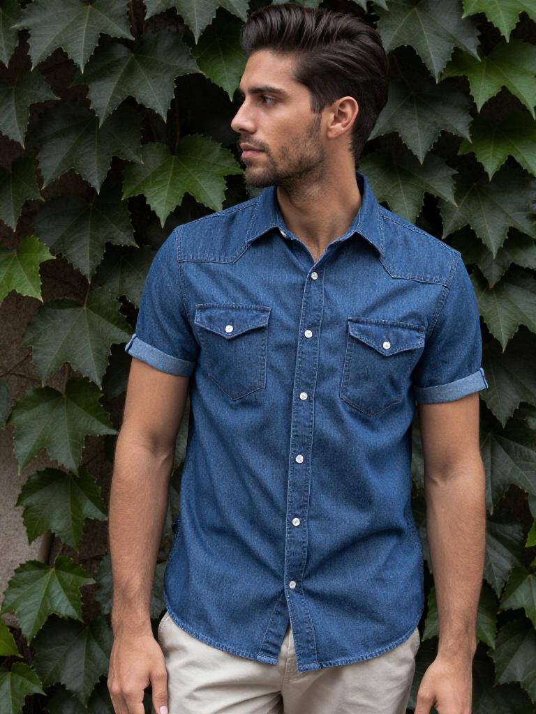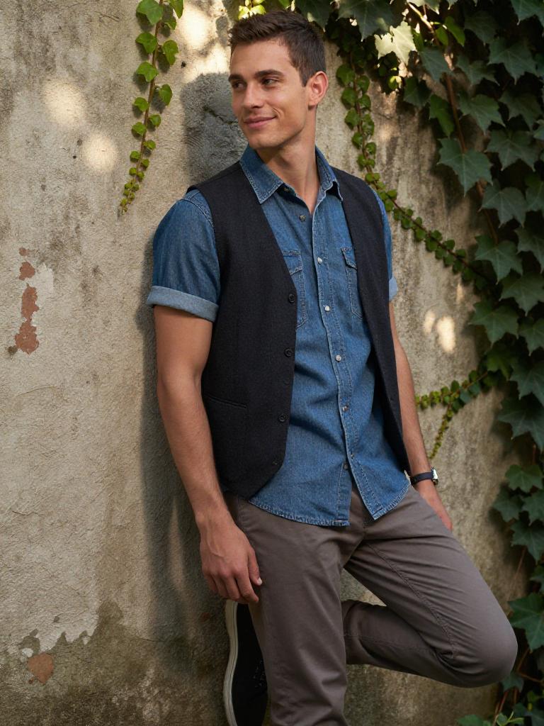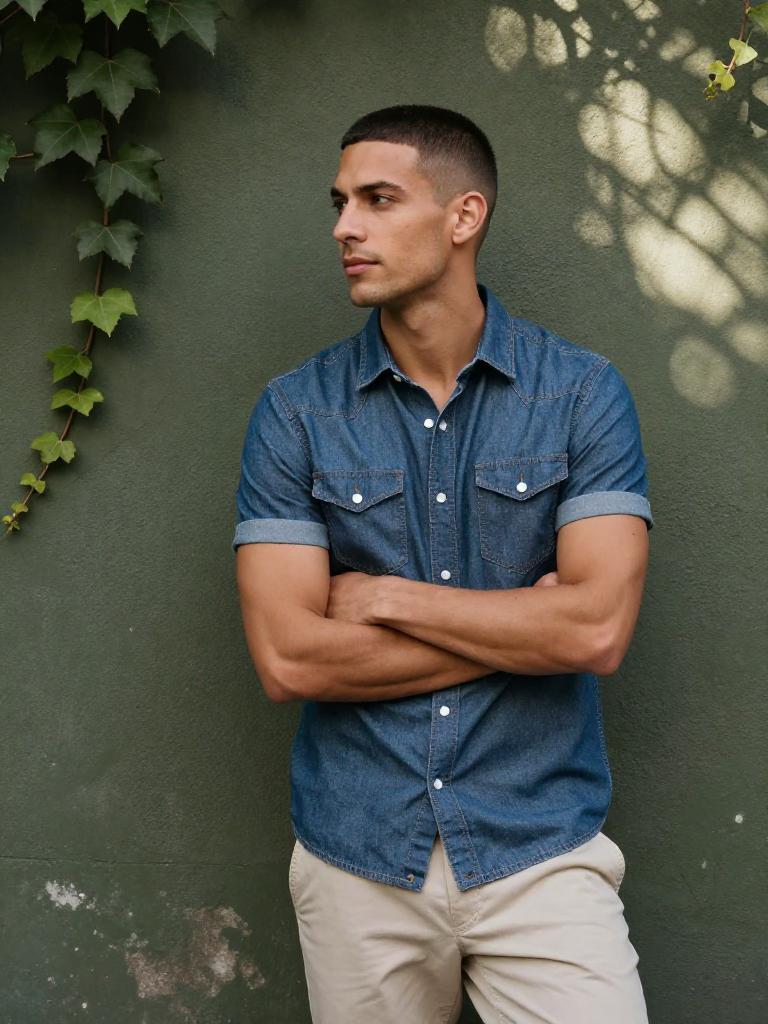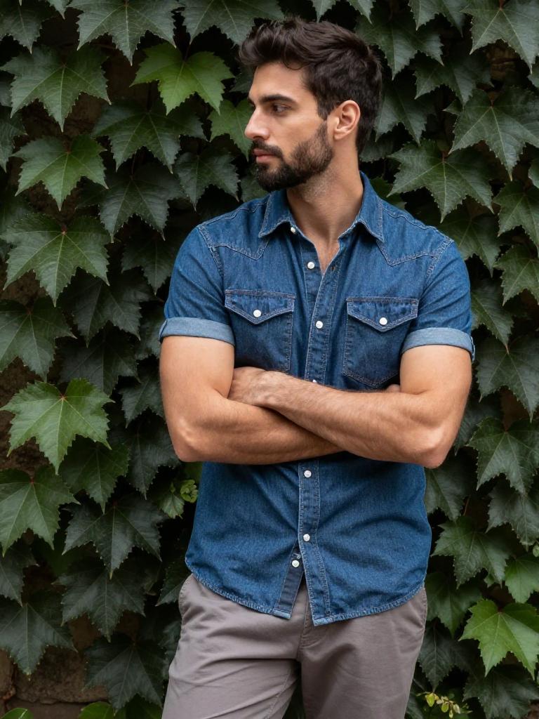 Man wearing denim t-shirt, relaxed outdoor portrait of a young man in a short-sleeve denim shirt, dark-haired man with short beard and strong jawline styled in indigo denim shirt left open over a dark vest and neutral pants standing crossing his arms loosely while leaning into the green wall against ivy-covered wall with dense green leaves, moody natural light, lifestyle fashion photography, high resolution