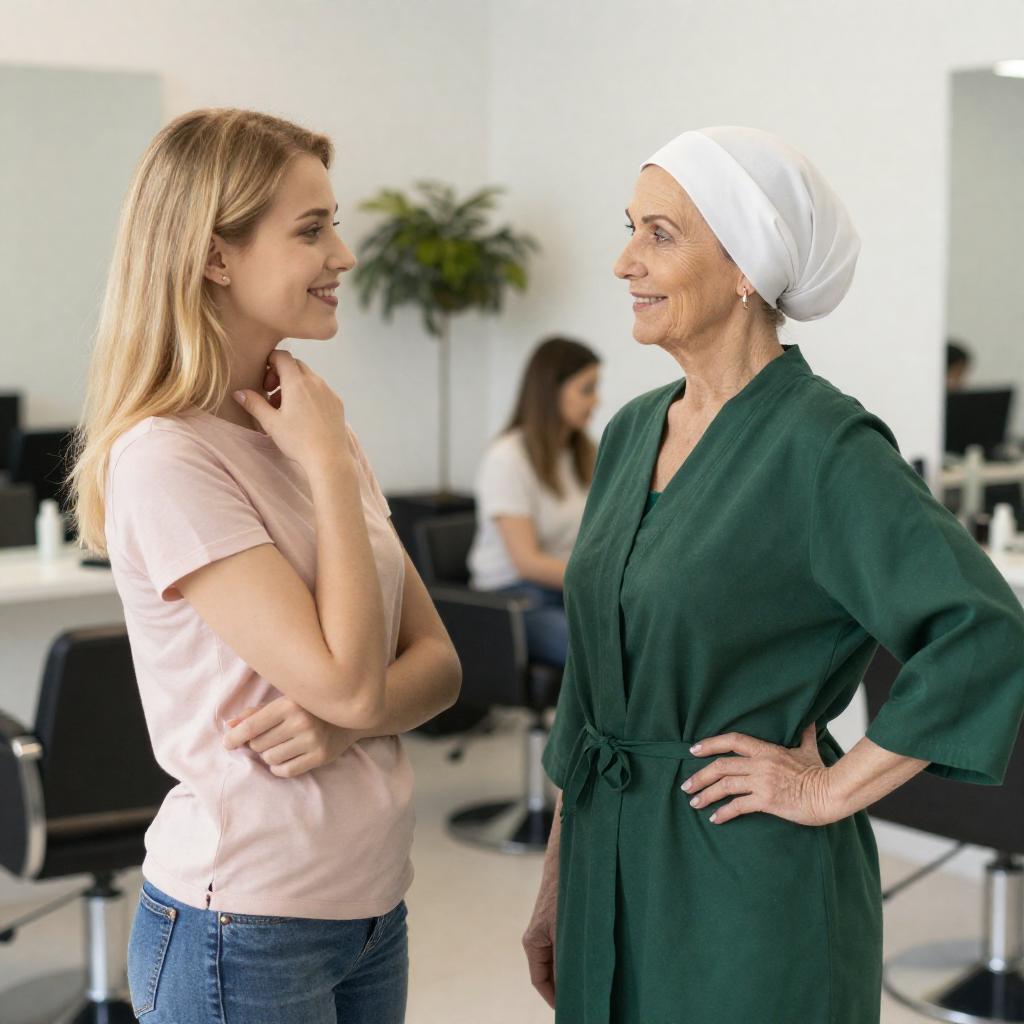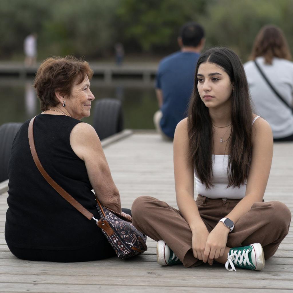 Photograph of two women on a wooden dock. Elder woman with short brown hair, black sleeveless top, and patterned bag, sits on left, looking at younger woman. Younger woman with long dark hair, white strapless top, brown pants, and green sneakers, sits cross-legged on right, looking down. Background includes blurred people, black tires, and green trees. Elder woman smiles slightly, younger woman has neutral expression. Two other people in background.