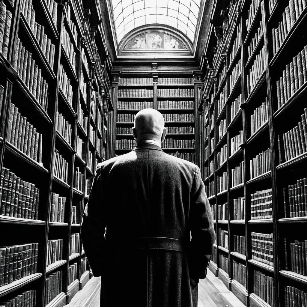 Black and white photo of a bald elderly man wearing a dark coat, standing with his back to the camera in an ancient library. The library features towering wooden shelves filled with old books and a large arched skylight ceiling providing soft ambient light. The image captures a wide-angle view emphasizing the extensive collection of books and the historic atmosphere.