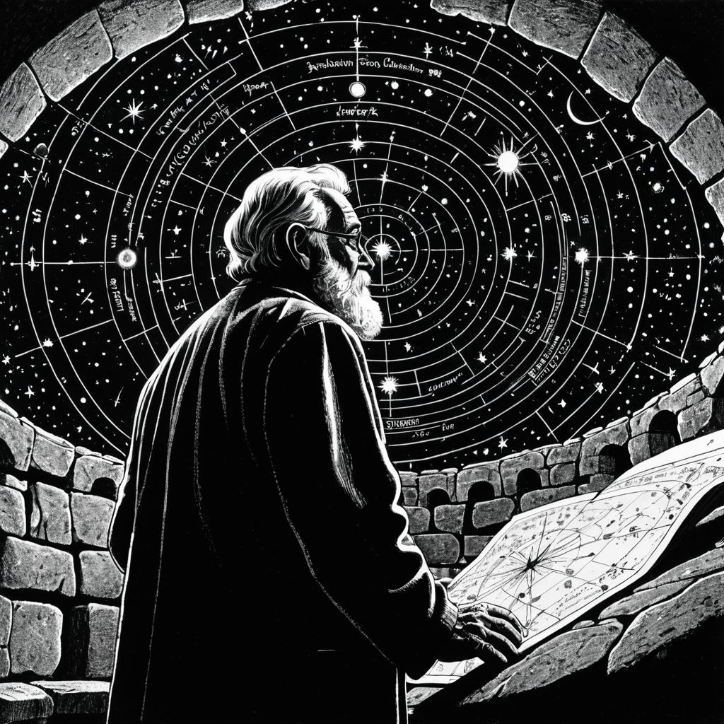 Detailed pencil illustration of a elderly male historian with a bald head and spectacles exploring a ancient library filled with towering shelves of old books, black and white, sharp line art, wide-angle composition, pronounced contrast and soft ambient lighting with subtle shadows.