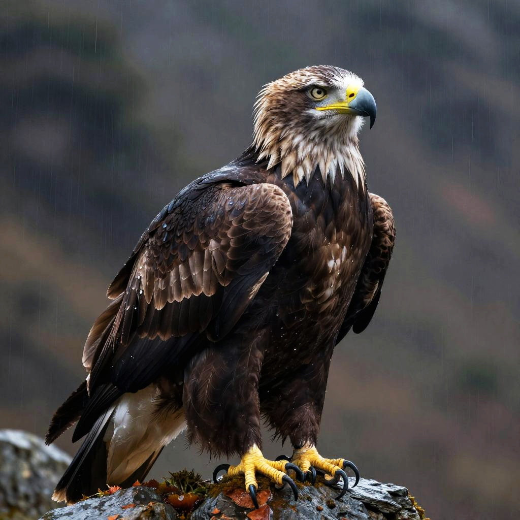 A high-quality illustration of a majestic eagle at rest, its matte black feathers and piercing amber gaze set against a dense misty rainforest canopy. The image conveys an aura of power, serenity, and noble grandeur.