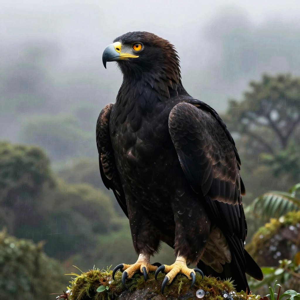 Majestic Black Eagle in Misty Rainforest
