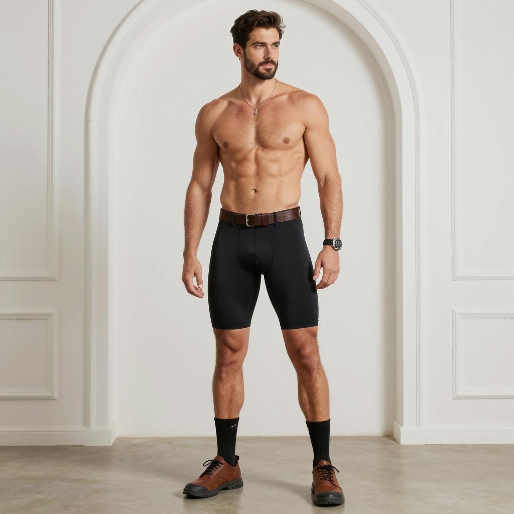 Man white jeans outfit, photorealistic, shirtless male model, muscular, defined abs, tan skin, short brown hair, stubble, wearing white pants, tan belt, necklace, standing in outdoor setting, modern building background, potted plant on left, daytime, natural light, casual, confident expression, front view, full body