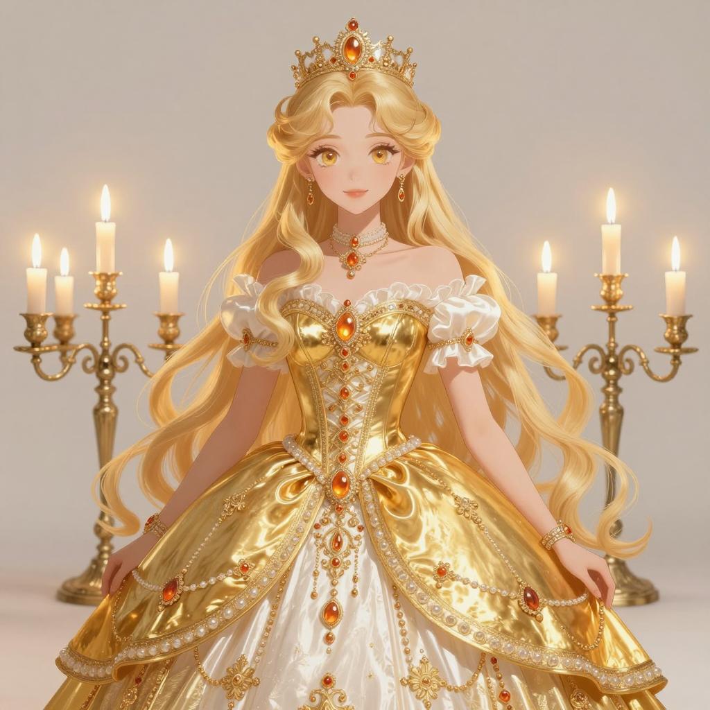 Digital illustration of a blonde anime princess wearing a luxurious gold and white ball gown. The character has long blonde hair, golden eyes, and intricate jewelry with orange gems. She is flanked by two antique-style candelabras with glowing candles, adding a regal and mystical atmosphere.