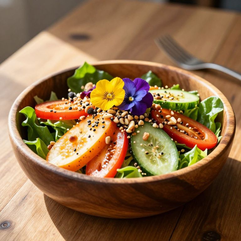 Garnished fresh salad bowl filled with vibrant vegetables, sprinkled with toasted nuts and seeds, colorful edible flowers on top, wooden salad bowl on farmhouse table, warm natural sunlight, healthy and wholesome food styling
