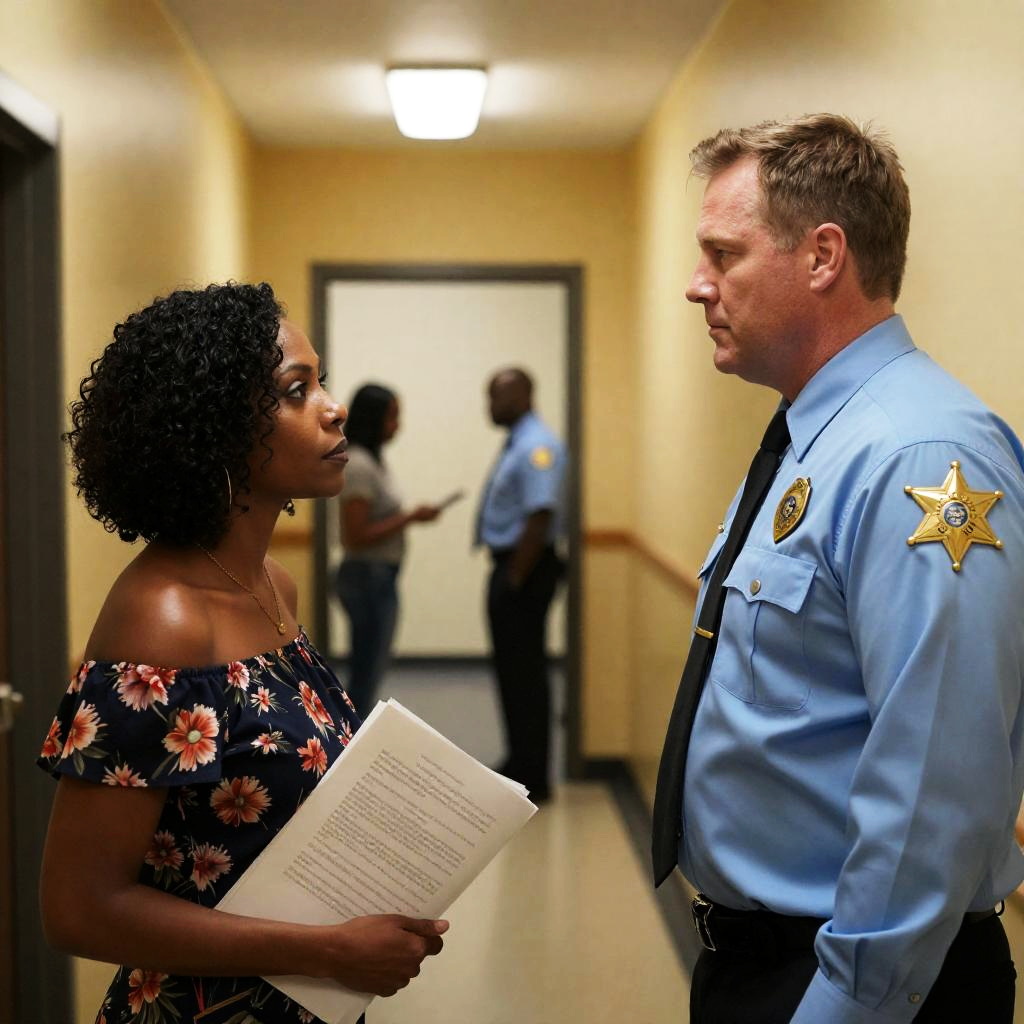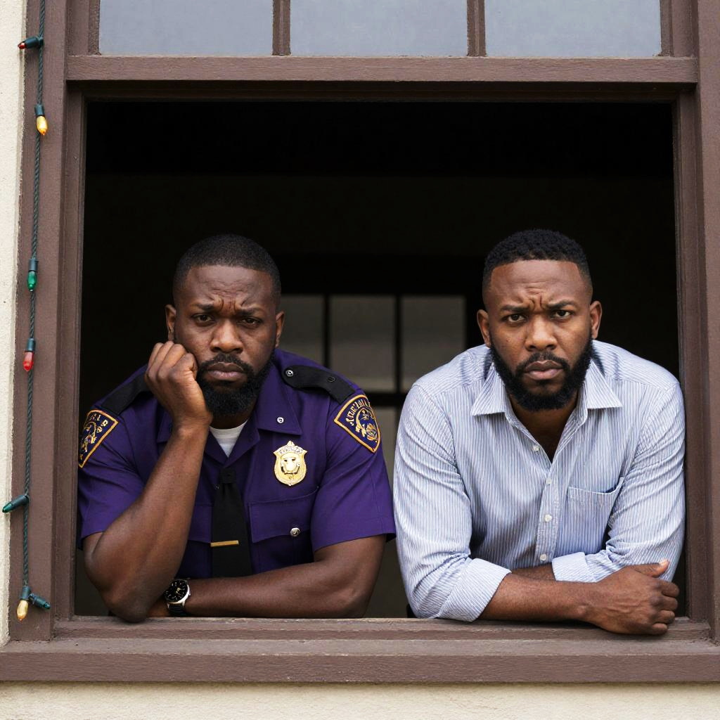 Photograph of a white male police officer with short brown hair and intense expression, wearing a black uniform, standing in front of metal bars. A black male inmate with short hair and serious expression, wearing a white shirt, holds the bars from behind. Indoor setting with wooden door frames.