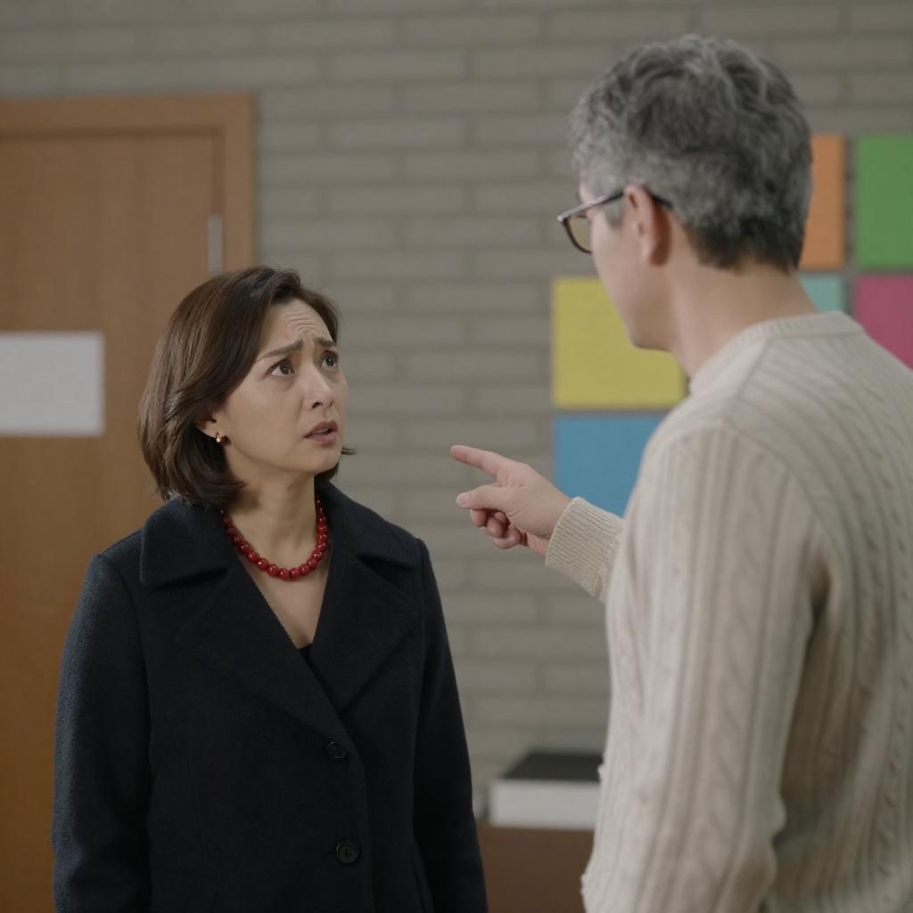 Photograph of three people in a wooden hallway. Middle-aged woman in green plaid dress, arms out, looks up at man in white shirt and brown pants holding a dark coat. Young man in brown plaid shirt and olive pants stands to the left. Warm lighting, wooden door, small wooden side table with a tray.